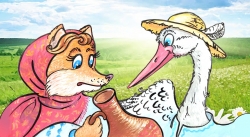 Он уже лисичка йде до журавля в гостину. А журавель наварив такої-то смачної страви: узяв і м'яса, й картопельки, й бурячків – усього-усього, покришив дрібненько, склав у глечичок з вузькою шийкою та й каже: